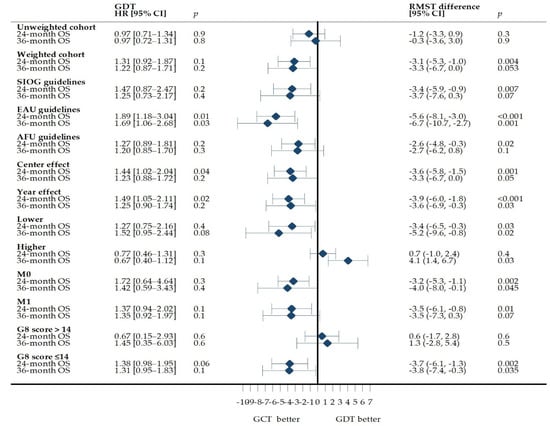 Our observation of a higher probability of GCT in patients with metastatic disease (aOR for GDT in metastatic disease (95% CI) = 0.34 (0.17–0.69); p = 0.003) contrasts with Ellis et al.’s [] report of a lower probability of GCT in patients with metastatic disease (OR (95% CI) = 0.09 (0.03–0.31); p ≤ 0.001). However, the mean age in Ellis et al.’s cohort was 61 (vs. 81 in our study), and only 22 (3%) of their patients had metastatic disease (vs. 63% in our study). This difference may be explained by the fact that the SIOG, EAU, and AFU guidelines considered ADT to be a standard treatment in older men with metastatic, hormone-sensitive prostate cancer. Our results are also consistent with reports of greater guideline compliance in patients receiving ADT [].