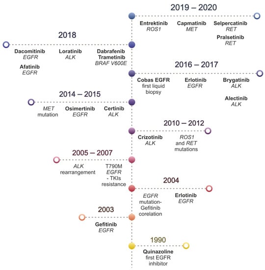 The status of non-small cell lung cancer (NSCLC) is a dynamically evolving landscape. Over the past decades, the advancement of knowledge, the discovery of new drugs, and the diagnostic possibilities have grown exponentially, setting new standards in oncology (Figure 1). Such improvement resulting from continuous technological development allows us to get insights into the molecular mechanisms of cancer cells. NSCLC, targeted by hundreds of research groups, is the infamous winner of the world’s epidemiological statistics on cancer [1,2]. The growing number of patients over the last decade has demanded putting more effort into cancer research, which has resulted in a better understanding of the biology of lung cancer. This knowledge allows us today to practice personalized medicine in which the therapeutic decision depends on the characteristics of the cancer of individual patients.