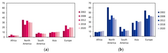 The number of people diagnosed with lung cancer per 100,000 inhabitants. (a) Incidence among women concerning world regions in 2002–2020; (b) Incidence among men concerning world regions in 2002–2020 [1,2,39,40,41].