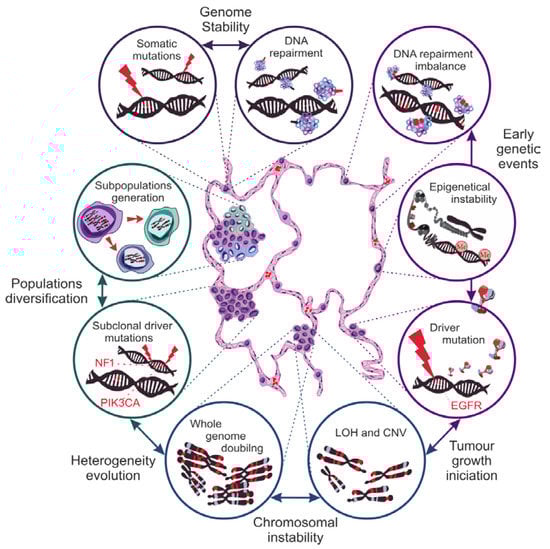 The heterogeneous nature of the composition and the growth of NSCLCs is the main obstacle in the therapy of patients in the advanced stage of the disease. All stages of carcinogenesis, from pre-initiation to progression, must be examined to elucidate the underlying causes of this phenomenon. Unfortunately, the multi-layered nature of NSCLC evolution is like a Gordian knot, remaining unsolved. Nevertheless, our knowledge of NSCLC biology is growing, leading to improved conclusions. The first is that genetic disorders are the basis of the neoplastic process [50,51]. Although carcinogenesis begins with a genetic mutation, it should be remembered that a single mutation is not enough for a neoplastic transformation (Figure 3). A pivotal factor in carcinogenesis is increasing genetic instability [52,53,54,55]. By genetic instability, we understand the variability in the severity of disturbances in DNA structure between generations of cells in a given population. Genome instability is, in a sense, a natural phenomenon inherent to the aging process of cells, which, in healthy tissues, manifests itself as somatic mosaicism [56]. On the other hand, tumorigenesis exacerbates it, generating variability at chromosome levels, epigenetic processes, or microsatellite structures.