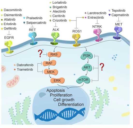 Schematic representation of the leading signaling pathways for which FDA-approved inhibitory substances were developed thus far (EGFR—epidermal growth factor receptor; HER2—human epidermal growth factor receptor 2; ALK—acute lymphoma kinase; ROS1—c-ros1 oncogene; NTRK1—neurotrophic tyrosine kinase receptor type 1; MET—tyrosine-protein kinase Met; RAS—rat sarcoma 2 viral oncogene homologs family; RAF—proto-oncogene c-RAF; MEK—mitogen-activated protein kinase; ERK—extracellular signal-regulated kinases; Pi3K—phosphoinositide 3-kinases; AKT—protein kinase B; mTOR—mechanistic target of rapamycin kinase).