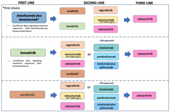 After the outstanding results of the IMbrave trial, atezolizumab plus bevacizumab combination has been considered to be the optimal strategy for first-line treatment. An important challenge is represented by the choice of the correct sequence for the treatment of later lines of therapy, as described in Figure 1. First, atezolizumab plus bevacizumab is the first treatment option for advanced disease, and sorafenib and lenvatinib MKIs, which have represented for years the only choice for first-line treatment, can now be considered for subsequent lines after atezolizumab bevacizumab failure. However, SHARP and REFLECT trials have investigated the use of sorafenib and lenvatinib in first-line treatment and, so far, only retrospective analyses of their use in second-line treatment have been published. Moreover, a limitation in the use of atezolizumab could be determined by the presence of uncontrolled autoimmune disease, while bevacizumab should be avoided in patients with high risk of bleeding. The other approved MKIs that are used in second-line treatment (regorafenib, ramucirumab, cabozantinib) have been investigated after sorafenib failure and there is a lack of evidence of their efficacy after atezolizumab plus bevacizumab failure. On the other hand, as the efficacy of the abovementioned MKIs has been largely demonstrated but there is no evidence of their direct comparison, international guidelines suggest their use even after atezolizumab plus bevacizumab progression. Another still-unanswered question is if an anti-PD-1 agent (nivolumab or pembrolizumab) could still be offered after progression of ICI-based therapy, as the anti-PD-L1 atezolizumab. In the same way, is it possible to treat patients with an anti-VEGF (ramucirumab) after bevacizumab failure? This strategy has proven effective in other diseases such as colorectal cancer but in HCC, data are very limited. Furthermore, so far only cabozantinib has been approved for third-line treatment, as 27% of patients enrolled in the CELESTIAL trial had already received two precedent treatment lines (sorafenib in the first line, ICI in the second). Nevertheless, there is no evidence of cabozantinib treatment after sorafenib and regorafenib or sorafenib and ramucirumab drugs. This and other questions remain unsolved. Future large clinical trials that include different treatment scenarios with combinations of different classes of agents in advanced settings could help define the correct treatment sequence of HCC.