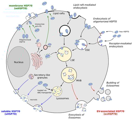 In addition to mHSP70 and evHSP70, the chaperone can also be found in a free soluble form, which was previously thought to result exclusively from passive release upon cell death []. In particular, necrosis rather than apoptosis was assumed to be responsible for the release of sHSP70 []. However, cell death accounts only for a minor fraction of sHSP70, and it is mainly released in an active manner []. Mambula and Calderwood postulated an endolysosomal route as a mechanism for solubleHSP70 (sHSP70), as the secretion correlated with the lysosomal marker lysosomal-associated membrane protein 1 (LAMP1) and could be inhibited by lysosomotropic compounds []. Moreover, they showed that HSP70 could enter lysosomes via ATP-binding cassette (ABC) family transporter proteins []. Interestingly, ABC transporters are also expressed on endosomes and exosomes, where one could postulate a possible way for HSP70 loading into exosomes. The secreted chaperone was also found to bind back to the plasma membrane, indicating an alternative route to the lipid raft-mediated pathway for membrane-associated HSP70 [].