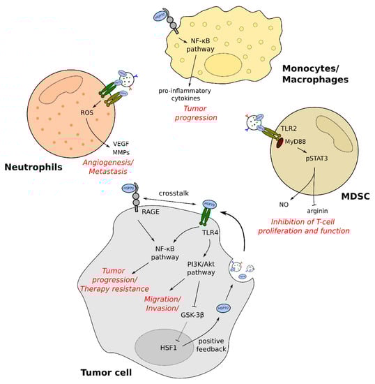Another target of exHSP70 is the receptor RAGE, which was shown to result in a pro-inflammatory response via ERK-dependent NF-κB activation []. Interestingly, RAGE was also found to be overexpressed in cancer, where it was correlated to tumor size and cancer stage [,]. Additionally, RAGE is expressed on immune cells, such as monocytes or macrophages, further extending possible targets for exHSP70 []. It is also described that RAGE interacts with TLR4 and that this crosstalk leads to MyD88-dependent activation of NF-κB [,] (Figure 2).