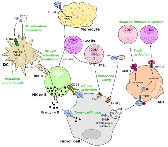 In the case of inflammation, intracellular HSP70 expression is dramatically increased and exerts cytoprotective functions. This is achieved both through classical chaperone functions, such as refolding and repair of proteins, and by direct inhibition of apoptosis []. Since excessive apoptosis can lead to severe human inflammatory diseases (HIDs), HSP70 plays a crucial role in balancing the appropriate response to cell stress. However, in cancer, HSP70 is known to be overexpressed, upsetting the balance and increasing proliferation, invasiveness, and resistance of malignant cells []. As described in the previous chapter, HSP70 is known to translocate into the extracellular milieu primarily upon stress stimuli. Moreover, exHSP70 was shown to exert pro-inflammatory functions, leading to increased tissue damage, indicating a dual role of HSP70 []. In the following section, we provide an overview of the general mechanisms of exHSP70 in immunity and summarize current data of its functions towards immune cells in the tumor microenvironment.