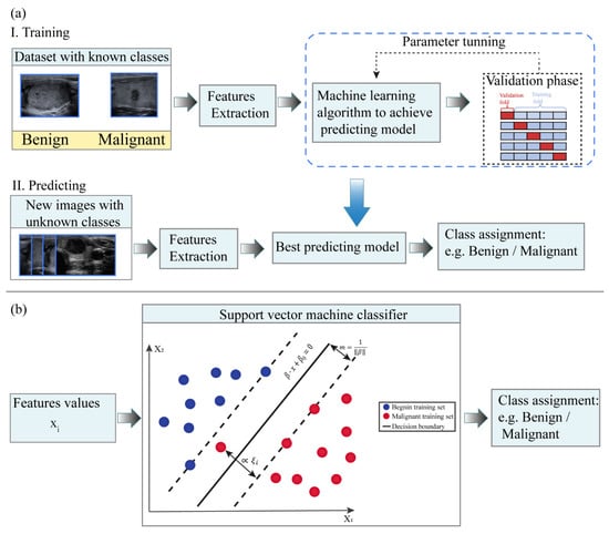 Historically, ML algorithms were applied in CAD systems for classifications purposes [20]. Subsequently, this method was used as a step of radiomics analysis. In this section we describe the workflow of the ML algorithm with classification task frequently encountered in the CAD framework [10,21,22] (Figure 1). A supervised ML model is composed of two phases, i.e., training and application phase (Figure 1a). In the training phase, a set of input images with their corresponding class labels are used to train the predicting model. From the input image, a region of interest (ROI) is delineated manually or semi-automatically by expert clinicians. Subsequently, a set of image features, e.g., morphological and grey level-based features, are extracted. Differently from other methods that will be discussed subsequently in this work, in ML algorithms of CAD systems, the extraction and selection of image features are performed manually by the expert. It represents a crucial step in order to identify the significant variables that can be correlated with the medical endpoint. In CAD applications, the features used in the analysis are those closely associated with what clinicians use in their diagnosis of the lesions [4]. Subsequently, the features are entered as input to the ML algorithm to train the model.