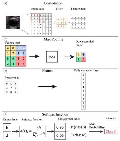 (a) Numerical example of the functions that compose the CNN architecture: (a) convolution, (b) max pooling, (c) flattening, (d) softmax function.