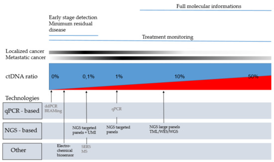 The first challenge in detection of ctDNA was due to the low quantities of DNA extracted from plasma. While amounts of cfDNA are higher in plasma from patients with cancer, ranges of elevation remain around an average of 3–4 times the quantity of a healthy individual [5]. However, the most challenging technical aspect is the detection of the low ratio of ctDNA representing 1 to 10% of cfDNA for advanced stages and until <0.1% particularly in early stages [5] (Figure 1).