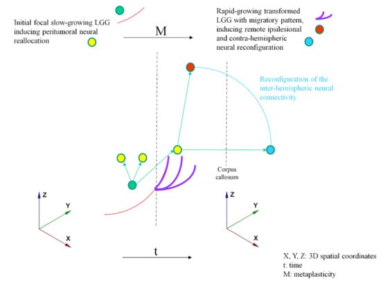 In adaption to the behavioral modifications of the LGG over time (mutational instability and clonal expansion correlated to risk of malignant transformation, with acceleration of the growth rate and/or redirection to a more diffuse pattern of invasion), the metaplastic potential of the connectome with spontaneous and induced spatiotemporal reorientation of mechanisms of neural reorganization (M).