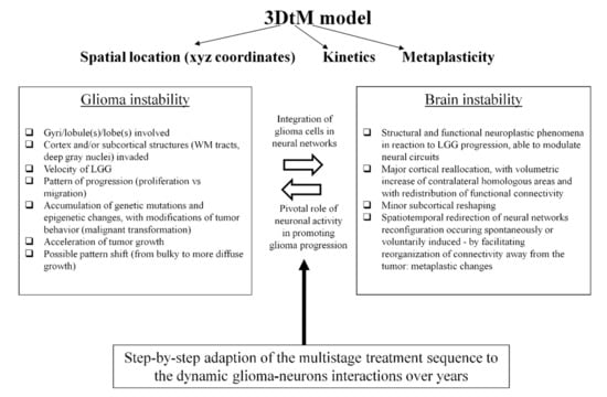 Such an improved knowledge of glioma–neurons dialogue, which depends on the LGG course and its changes due to genomic instability, as well as the real-time connectomal adaption, may enable to better predict the consequences of each therapeutic step and then to elaborate an optimal personalized management. To this end, an original model based on perpetual interactions between glioma plasticity and brain metaplasticity is proposed (Figure 1).