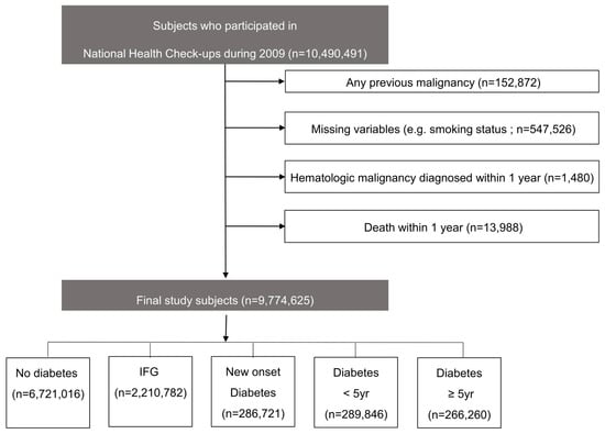 The definition of diabetes was defined by one or more of the following: the presence of the diagnosis codes E11.x–E14.x from the 10th revision of the International Statistical Classification of Diseases (ICD-10), prescription(s) of oral and/or injectable antidiabetic medications, or a fasting plasma glucose ≥ 126 mg/dL [17] during the national health screening program. This definition of diabetes has been described elsewhere [18]. Impaired fasting glucose (IFG) was defined as a fasting glucose level of 100–125 mg/dL [17]. Based on their glycemic status, the participants were categorized into five groups, as follows: no diabetes (fasting plasma glucose <100 mg/dL), IFG (fasting glucose 100–125 mg/dL), newly detected diabetes, diabetes duration <5 year, and diabetes duration ≥5 year [18]. Their glycemic status during the 2009 national health screening was defined as the baseline glycemic status.