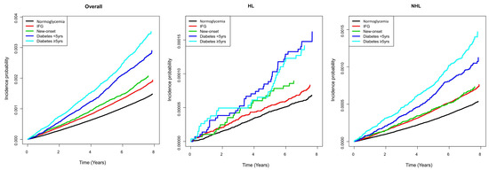 Cumulative incidence of the overall hematologic malignancy, Hodgkin’s lymphoma, and non-Hodgkin’s lymphoma, according to the baseline glycemic status. IFG, impaired fasting glucose; HL, Hodgkin’s lymphoma; NHL, non-Hodgkin’s lymphoma.
