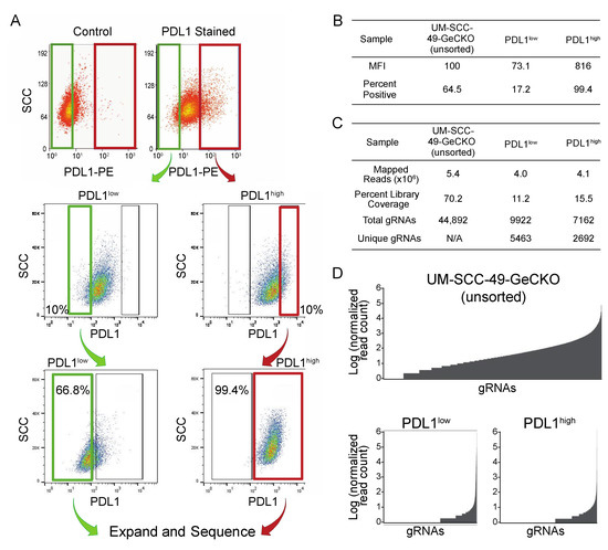 Workflow for generation of UM-SCC-49-GeCKO pool, cell sorting, and sequencing of final populations. 1. UM-SCC-49 was transduced with a lentiviral pooled sgRNA library (GeCKO v2). 2. Live cells were selected based on PDL1 expression using a PE-conjugated antibody directed against PDL1. PE fluorescence distribution was plotted on a histogram. The fractions of cells with the highest and lowest PE fluorescence (10% each) were expanded separately in culture and re-sorted to enhance respective phenotypes. 3. DNA was harvested from final populations for next-generation sequencing of sgRNA barcodes.