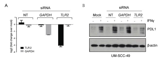 TLR2 depletion attenuates IFNγ-mediated upregulation of PDL1 in UM-SCC-49 cells. (A) UM-SCC-49 cells were treated with siRNA as indicated, and knockdown of TLR2 and GAPDH RNA expression was tested by qPCR. (B) Cells were transfected with non-targeting (NT), GAPDH, or TLR2 siRNA for 24 h were then treated −/+ 10 ng/mL IFNγ for 48 h, and protein expression was assessed by immunoblot as indicated. The uncropped Western blots have been shown in Figure S3.