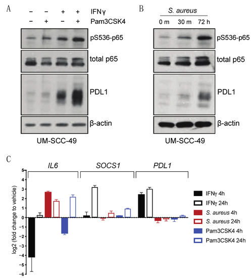TLR2 agonists drive PDL1 protein accumulation in UM-SCC-49 cells. (A) UMSCC49 cells were treated with or without 300 ng/mL Pam3CSK4 (Invivogen) with or without 10 ng/mL IFNγ for 72 h. (B) UM-SCC-49 cells were treated for indicated duration with 0.075% S. aureus (Millipore) and lysates were analyzed by immunoblot. (C) qPCR analysis of IFNγ and TLR effectors and PDL1 expression in UM-SCC-49 treated with S. aureus or Pam3CSK4 for either 4 h or 24 h as indicated.