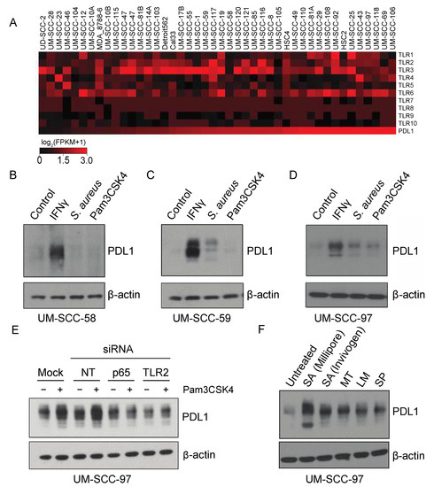 Finally, given the ability of UM-SCC-97 to strongly upregulate PDL1 in response to TLR2 agonists, we tested whether Pam3CSK4-mediated PDL1 induction was dependent upon TLR2 or p65 expression. UM-SCC-97 cells were transfected with siRNA targeting TLR2, RELA (p65), or controls, and stimulated with either vehicle or Pam3CSK4. Pam3CSK4 did not induce PDL1 expression in either the TLR2 and RELA knockdowns, indicating expression of these genes is required for Pam3CSK4-mediated PDL1 induction (Figure 5E). To further interrogate the role of microbes in PDL1 induction, we tested whether other common commercially available infectious bacteria were sufficient to phenocopy S. aureus in the model. Importantly, we found that the M. tuberculosis, L. monocytogenes and S. pneumoniae bacterial strains were all able to induce PDL1 expression, and although dependency upon TLR2 has not been established in this system, all reportedly activate TLR2 in other settings (Figure 5F) [26,27,28,29]. It is therefore possible that a wide variety of bacterial strains can contribute to an immunosuppressive phenotype in cancer cells.