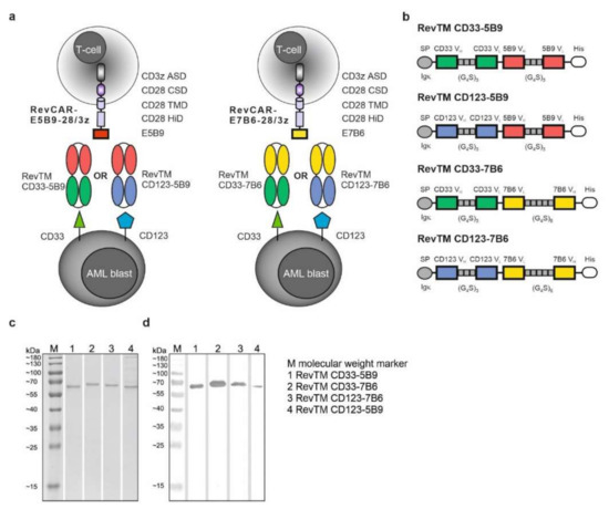 Recently, our group described the general structure of a RevTM [15]. Here, the RevTMs were arranged by cloning the anti-CD33 [14] or the anti-CD123 [17] scFv either to the anti-5B9 or to the anti-7B6 scFv [15], thus generating four different RevTMs. These were further cloned separately into a lentiviral vector and 3T3 cell lines were established to produce the respective RevTM. Purification from cell culture supernatants was achieved via Ni-NTA affinity chromatography [15]. To estimate yield and purity, purified RevTMs were separated via SDS-PAGE and analyzed using Coomassie staining or immunoblotting as described elsewhere [15,18].