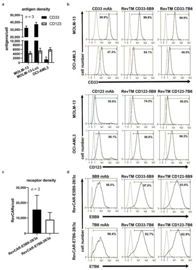 The first step to prove functionality of the novel RevTMs was to analyze binding capability of the bispecific scFv-based RevTMs on the one hand towards CD33 or CD123 expressed on the AML cell lines MOLM-13 and OCI-AML3, and on the other hand towards the RevCAR-E5B9-28/3z or RevCAR-E7B6-28/3z expressed on genetically modified T-cells. This was accomplished by performing cell surface staining using flow cytometry. As a prerequisite, expression of the antigens CD33 or CD123 on the AML cell lines MOLM-13 and OCI-AML3 was confirmed and quantitatively determined using an anti-CD33 mAb and anti-CD123 mAb, respectively (Figure 2a,b). Moreover, analysis of the antigen expression pattern enables a detailed characterization of the different AML cell lines that were used as target cells for subsequent functional assays. In general, the MOLM-13 and OCI-AML3 cell lines expressed both markers, CD33 and CD123, but with different abundance and density. With regard to the antigen density level, MOLM-13 cells expressed clearly more CD33 than CD123 on their cell surface. Conversely, OCI-AML3 cells showed a lower surface expression of CD33 compared to CD123, while the level of CD123 was nearly comparable on both cell lines. It is worth mentioning that the recombinant expression of Luc did not affect the expression level of the target antigens on MOLM-13-Luc cells, which were also used as target cells in subsequent functional assays. Furthermore, the expression of RevCAR-E5B9-28/3z or RevCAR-E7B6-28/3z on genetically modified T-cells was proven and the number of receptors was quantified using anti-5B9 and anti-7B6 mAbs, respectively (Figure 2c,d). Most importantly, all generated RevTMs were able to bind to CD33 or CD123 antigens on the AML cell lines MOLM-13 and OCI-AML3 as well as to the RevCARs on the RevCAR-E5B9-28/3z or RevCAR-E7B6-28/3z T-cells as shown in Figure 2b,d.