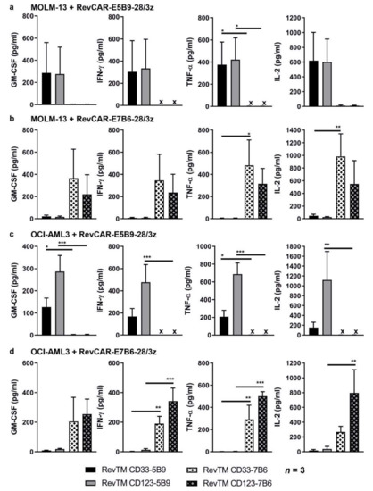 Upon binding of RevTMs crosslinking AML cells and RevCAR T-cells, RevCAR T-cells are activated resulting in cytokine release and cytotoxic reactivity. In order to prove that, RevCAR-E5B9-28/3z or RevCAR-E7B6-28/3z T-cells were co-cultured with MOLM-13 or OCI-AML3 cells in the presence of RevTMs directed either against the E5B9- or E7B6-RevCARs, respectively. As negative controls, AML cells and RevCAR-E5B9-28/3z T-cells were incubated together with the irrelevant RevTMs CD33-7B6 or CD123-7B6 that are not able to bind to RevCAR-E5B9-28/3z T-cells. Likewise, RevCAR-E7B6-28/3z T-cells were co-cultured with AML cell lines in the presence of the irrelevant RevTMs CD33-5B9 or CD123-5B9. As shown in Figure 3, RevCAR T-cells significantly secreted cytokines after cross-linkage with target cells by the respective matching RevTMs, although high donor variability was observed. These included the secretion of GM-CSF, IFN-γ, TNF-α, and IL-2 among 12 human cytokines tested (Figure 3). Significant release was not detected for the other tested cytokines including, e.g., IL-6. In the presence of irrelevant RevTMs no cytokines were detected in the supernatants.
