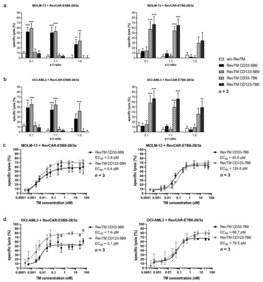 To evaluate the RevCAR T-cell mediated tumor killing, standard chromium (51Cr) release, luminescence-based and flow cytometry assays were performed as previously described [13,18,24]. Briefly, triplets of target cells were co-cultured with RevCAR T-cells under several conditions: in the (I) absence, (II) presence or (III) combination of RevTMs at different e:t ratios. For 51Cr release assays, MOLM-13 and OCI-AML3 cells were used, for luminescence-based assays MOLM-13-Luc cells were chosen and for flow cytometry assays patient-derived AML blasts were used labeled with eBioscience™ cell proliferation dye eFluor™670 (Thermofisher Scientific, Germany). AML cell lysis was determined at increasing RevTM concentrations in the co-culture cytotoxicity assays to calculate the half-maximal effective concentration (EC50) using GraphPad Prism 8.
