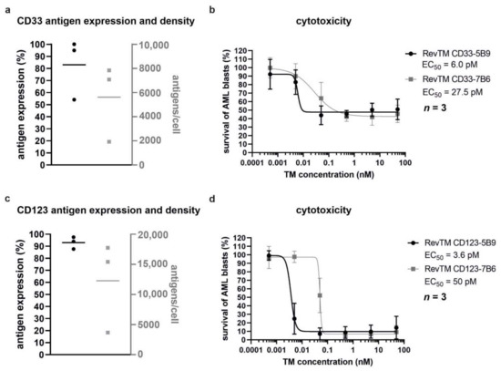 - Arndt, C.; Feldmann, A.; Von Bonin, M.; Cartellieri, M.; Ewen, E.-M.; Koristka, S.; Michalk, I.; Stamova, S.; Berndt, N.; Gocht, A.; et al. Costimulation improves the killing capability of T cells redirected to tumor cells expressing low levels of CD33: Description of a novel modular targeting system. Leukemia 2013, 28, 59–69. [Google Scholar] [CrossRef]