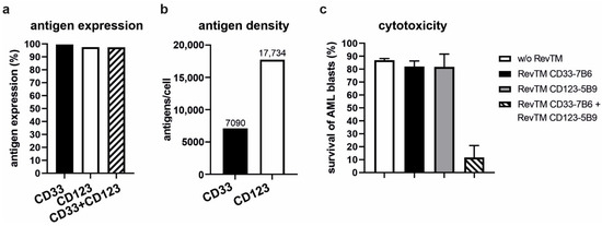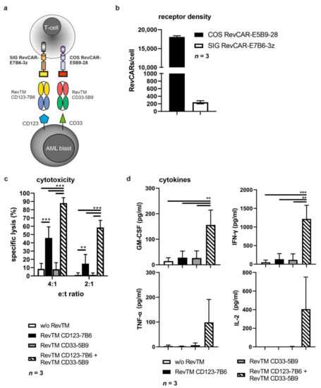 Treatment of acute myeloid leukemia (AML) is still challenged by inadequate long-lasting anticarcinogenic responses due to its heterogeneity and poorly known resistance mechanisms [1]. Due to the lack of beneficial outcomes for the patients that undergo conventional therapy, which mainly comprises chemotherapy usually followed by stem cell transplantation [2], there is an urgent need for innovative strategies. Thus, in the past years, the treatment of AML has been significantly shifted towards the development of targeted approaches [3]. Current targeted strategies clinically implemented mainly include the administration of gemtuzumab ozogamicin (GO), an antibody (Ab)-drug conjugate targeting the surface antigen CD33 [4]. Alternatively, other promising approaches such as novel T-cell-based immunotherapies have shown better outcomes for the treatment of acute lymphoblastic leukemia (ALL), lymphoma and multiple myeloma [5]. Examples of such successful clinical translation are CD19- and BCMA-specific CAR T-cells [6,7,8,9]. However, preclinical and early clinical trials using targeted immunotherapeutic approaches demonstrated the challenging setting of AML, in which relapse driven by residual leukemic stem cells (LSCs), tumor escape variants as well as the lack of suitable targetable surface antigens are the main obstacles. Even though an ideal target has not yet been identified, CD33 and CD123 are promising candidates being expressed on AML bulk cells and LSCs at initial diagnosis and relapse cases. Normally, AML cells express CD33, CD123, or even both, while lack of expression of both antigens (CD33 and CD123) is extremely rare [10,11]. Given this, the enthusiasm to exploit CAR T-cell-based technologies targeting these antigens is reflected by the promising number of early clinical trials currently ongoing. In this regard, an impressive and promising phase I clinical trial using UniCAR T-cells targeting CD123 for the treatment of CD123-positive hematologic and lymphoid malignancies (NCT04230265) proved to be a breakthrough. These promising results have demonstrated functionality and switchability of adaptor CAR T-cell systems for the first time in humans [12]. Given the heterogeneity of antigen expression on AML cells, combinatorial targeting approaches are required as an improved therapeutic tool. Bearing this in mind, and based on our experience working with conventional CAR T-cells [13] and modular Ab-based systems to redirect T-cells [14], we developed the adaptor Reverse CAR (RevCAR) platform [15]. This was particularly developed based on the established UniCAR system [16,17,18,19,20], aiming controllable and programmable combinatorial tumor targeting to improve tumor specificity and safety of CAR T-cell therapy. Particularly, RevCAR T-cells are engineered to express RevCARs that consist of the peptide epitopes E5B9 or E7B6 instead of a single-chain fragment variable (scFv) that is commonly used as extracellular domain in conventional second-generation CARs. Due to the lack of an antigen-binding motif, RevCARs do not recognize a tumor antigen and thus are primarily inactive. Cross-linkage between RevCAR T-cells and tumor cells is exclusively mediated by bispecific target modules (RevTMs). These RevTMs consist of two scFvs, one targeting the respective RevCAR E5B9 or E7B6 epitope and the other one the tumor antigen of interest (Figure 1a). The modular feature of this system allows the steering and rapid on/off switch of the RevCAR T-cell activity by dosing of the RevTMs, avoiding side-effects like on-target/off-tumor toxicity and cytokine release syndrome (CRS) commonly reported for conventional CAR T-cell approaches [21,22]. The small size of the RevCAR epitope molecules, with the E5B9 epitope consisting of 10 amino acids (aa) or the E7B6 of 18 aa, accordingly reduce the length of the RevCAR encoding genes. These features are of considerable value allowing the expression of multiple CAR genes using a single construct. Consequently, we have successfully generated Dual-RevCAR T-cells that can be used for targeting of prostate tumor cells following the Boolean logic gating [15]. These Dual-RevCAR T-cells express two separate RevCARs with different specificities, one RevCAR transmitting the activation signal and the other one mediating the costimulatory signal upon recognition of different antigens on the same tumor cell.