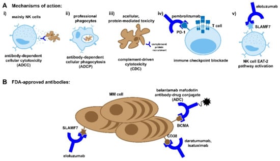 Antibody based therapies. (A) The mechanisms of action for monoclonal antibody and antibody-drug-conjugate therapies. As antibodies already play a role in the immune response against pathogens, these therapies harness the same pathways to elicit both cellular- and acellular-mediated toxicity of the target cell. These pathways include canonical killing of the target cell by immune cells ((i) ADCC, (ii) ADCP, and (iii) complement) as well as the “reprogramming” of immune cells to reactivate against the target cell ((iv) immune checkpoint blockade and (v) EAT-2 activation). (B) In addition to checkpoint blockade antibodies, there are several FDA-approved monoclonal antibodies and drug conjugates currently available to treat MM, which target several common markers of myeloma cells.