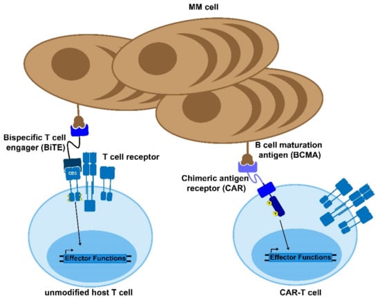 Bi-specific antibodies and CAR-T cells. Bispecific T cell engagers (BiTEs) and chimeric antigen receptor (CAR) T cells are novel therapies to treat MM and other diseases. The BiTE uses two antibody domains to crosslink the target cell to an immune effector cell in order to activate the host immune response against the tumor. Similarly, CAR-T cells are genetically modified to express a chimeric, MM-recognizing antigen that can bypass the normal T cell activation cascade to enable the CAR-T cell to respond to and kill target antigen-expressing cells.