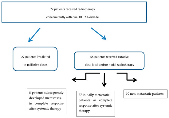 Of the 77 patients initially irradiated concomitantly with dual HER2 blockade, we excluded 22 patients who received palliative doses of irradiation, all sites combined, i.e., doses less than 40 Gy EQD2. Of the remaining patients, 37 patients had metastatic disease at the time of diagnosis, 8 patients subsequently developed metastases after initial treatment, and 10 patients had only locally or locoregionally advanced disease (Figure 1).