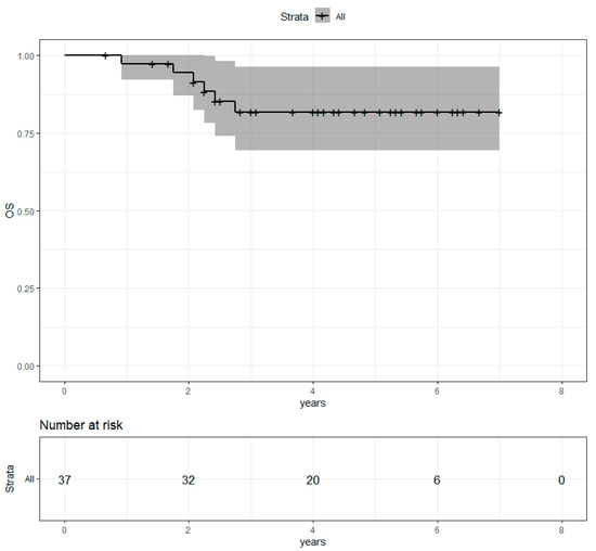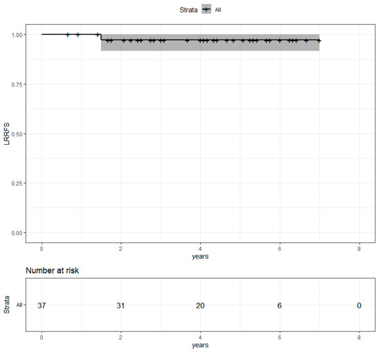 Median follow-up after radiotherapy was 4.1 years. Four-year overall survival (OS) was 81.7% (69.5%−96.2%) (Figure 2). Progression-free survival (PFS) was 65.7% (51.7%−83.6%) (Figure 3). Locoregional recurrence-free survival (LRRFS) was 97.1% (91.5%−100%) (Figure 4). Median OS, PFS and LRRFS were not reached.