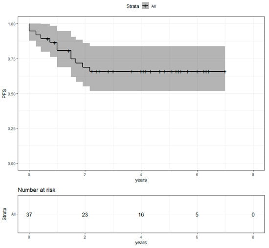 Progression-free survival of the population with metastatic disease at the time of diagnosis after concomitant RT and Pertu/Trastu dual HER2 blockade. Confidence intervals are provided in grey.