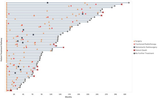 Swimmer Plot showing the treatment pathways for each patient in the cohort. The key is provided to the right. Individuals with no surgery at the beginning of treatment strategy were incidental, with primary and subsequent operations occurring at a later point during follow-up.