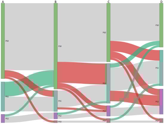 Sankey diagram demonstrating changes in performance status from initial diagnosis (A), after primary operation (B), before re-operation (C), and 6 months after re-operation (D). The length of the nodes and links between nodes are proportional to the number of patients. Red links indicate a worsening of performance status. Green links indicate improved performance status. Grey links indicate no change in performance status.