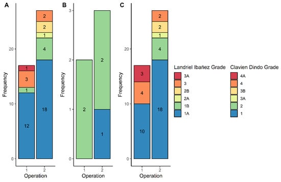 Stacked bar charts demonstrating post-operative complications graded according to Landriel-Ibañez classification (A,B) and Clavien-Dindo classification (C). The Landriel-Ibañez classification includes both surgical (A) and medical (B) complications. Frequency of each grade is demonstrated within the bars.