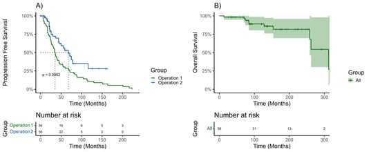 Kaplan Meier graphs demonstrating progression free survival with a log rank test between operation one and operation two (A); percentage at risk table is provided. Overall survival is demonstrated along with 95% confidence intervals (B). Censoring on both graphs is demonstrated by crosses on the curve.