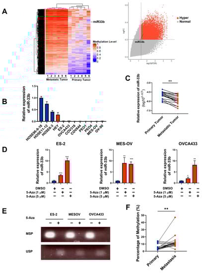 3.1. miR-33b Is Frequently Silenced by DNA Hypermethylation in Metastatic Ovarian Cancer Cells