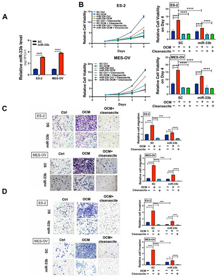 The intraperitoneal tumor microenvironment supports omental tropism of ovarian cancer, and OCM has been shown to highly mimic the TME of ascites or the omentum in promoting ovarian cancer cell growth and metastasis [5,23]. To understand the functional role of miR-33b, we established polyclonal miR-33b-overexpressing ovarian cancer cell lines, ES-2 and MES-OV (Figure 2A). XTT cell viability assays showed increased cell proliferation of both the ES-2 and MES-OV cell lines on Day 4 when cocultured in OCM compared to the control medium, whereas OCM-promoted cell proliferation was inhibited by overexpression of miR-33b (Figure 2B). We and others have reported that ovarian cancer cells utilize free fatty acids in the ascites for energy production and cell synthesis [29]. To examine whether fatty acids in OCM are the main source of energy for tumors, all fatty acids in OCM were first removed by CleanasciteTM Lipid Removal Reagent. XTT cell viability analysis was performed and showed that the cell growth rate of ES-2 and MES-OV cells was remarkably reduced when cocultured in lipid-depleted OCM (Figure 2B). Likewise, Transwell assays revealed that OCM-cocultured ovarian cancer cells showed up to a 5-fold increase in cell migration and invasion abilities (Figure 2C,D). However, both miR-33b overexpression and depletion of fatty acids by Cleanascite in OCM significantly impaired ovarian cancer cell migration and invasion (Figure 2C,D). Hence, our data suggest that OCM can support tumor growth and aggressiveness by providing fatty acids as an energy source and that miR-33b impedes the proliferation, migration, and invasion of ovarian cancer cells driven by OCM coculture.