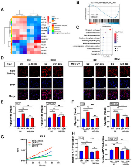 miR-33b regulates OCM-mediated lipid metabolic reprogramming of ovarian cancer cells. (A) Stable polyclonal ES-2 cell line with overexpression of miR-33b or scrambled control was treated with OCM for 24 h, and subsequently, total protein was extracted for LC-MS/MS proteomic study. Some of the downregulated and upregulated genes in stable miR-33b overexpressing ES-2 cells relative to scrambled control ES-2 cells were presented by heatmap. (B) Gene set enrichment analysis (GSEA) was employed to show the biological pathways that enriched in ES-2 cells overexpressing miR-33b compared to scrambled control. (C) Functional enrichment analysis was performed on 92 genes downregulated by miR-33b overexpression using KEGG database. (D–H) Ovarian cancer cell lines (ES-2 and MES-OV) were treated as described in (A), and lipid metabolic activities were examined. (D) Lipid droplet formation was assessed by immunofluorescent and lipid staining analyses. Lipid droplet was counterstained by Nile red (in red) and nuclei were stained by DAPI (in blue) before visualization with Zeiss LSM 980 (Zeiss, Jena, Germany). Scale bar: 50 μm. (E). The triglyceride level of ovarian cancer cells was quantified by Triglyceride Assay. (F) Lipolysis activity of ES-2 and MES-OV cells was detected by Lipolysis Colorimetric Assay. (G) β-oxidation of fatty acid was continuously monitored by Fatty Acid Oxidation Assay over time. (H) Cellular ATP production of ovarian cancer cells was determined by Luminescent ATP Detection Assay. (ns, no significant difference, * p < 0.05, ** p < 0.01, *** p < 0.001).