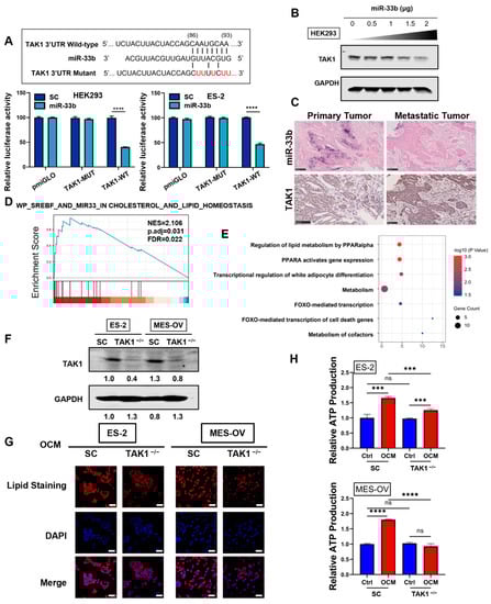 3.4. miR-33b Directly Targets TAK1, Which Is Involved in Lipid Metabolism Reprogramming of Ovarian Cancer