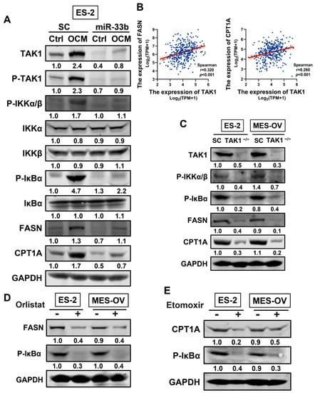miR-33b targeting TAK1/FASN/CPT1A/NF-κB signaling axis in ovarian cancer cells. (A) Scrambled control or stable miR-33b overexpressing ES-2 and MES-OV cells were treated with OCM or 1% FBS normal medium for 24 h. Protein contents of TAK1, P-TAK1, P-IKKα/β, IKKα, IKKβ, P-IκBα, IκBα, FASN, CPT1A, GAPDH were examined by WB. (B) Scatter plots depicting the correlation between TAK1 and FASN (right panel) or CPT1A (left panel) in TCGA-OV dataset. (C) ES-2 and MES-OV cells with scrambled control or stable knockout of TAK1 were cultured with OCM for 24 h. Protein contents of TAK1, P-IKKα/β, P-IκBα, FASN, CPT1A, GAPDH were determined by WB. (D) OCM co-cultured ovarian cancer cells were subjected to co-treatment of FASN inhibitor orlistat (30 µM) or DMSO for 24 h. Protein contents of FASN, P-IκBα, GAPDH were confirmed by WB. (E) OCM-cultured ovarian cancer cells were subjected to co-treatment of CPT1A inhibitor etomoxir (40 µM) or DMSO for 24 h. Protein contents of CPT1A, P-IκBα, GAPDH were evaluated by WB. The original western blot images were shown in the File S1.