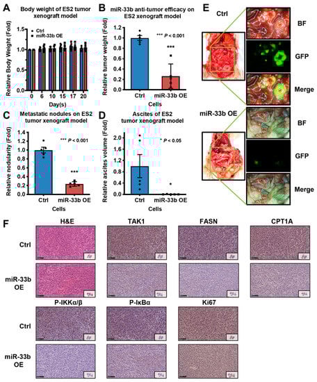 To examine the effects of miR-33b on ovarian tumor dissemination in vivo, GFP-labeled ES-2 cells overexpressing miR-33b or scrambled control were intraperitoneally inoculated into SCID mice. After 3 weeks with palpable tumors observed, the mice were sacrificed. In vivo results indicated that overexpression of miR-33b led to a significant reduction in tumor mass and the number of tumor nodules. Given that the body weight was similar for both groups, the weight loss of the control group was attributable to tumor burden when compared with the miR-33b overexpressing group (Figure 6A–C). Malignant ascites accumulation is one of the typical hallmarks of ovarian cancer progression [35]. The relative ascites volume was approximately 100-fold higher in SCID mice grafted with ES-2 parental control cells, whereas overexpression of miR-33b resulted in a near absence of ascites formed in vivo (Figure 6D). The colocalization of tumor nodules and organs in the peritoneal cavity was then imaged via fluorescence microscopy. Figure 6E depicts that overexpression of miR-33b led to much less metastatic tumor seeding in distant organs of mice. Subsequently, IHC was performed to assess the effect of miR-33b on the TAK1/FASN/CPT1A/NF-κB axis and Ki67 expression in vivo. The results showed that miR-33b overexpression reduced TAK1, FASN, CPT1A, P-IKKα/β, P-IκBα, and Ki67 protein expression in xenograft tumor tissues (Figure 6F). These results suggest that downregulation of miR-33b could trigger oncogenic properties through activation of the TAK1/FASN/CPT1A/NF-κB signaling axis and, as a consequence, facilitate peritoneal metastases of ovarian cancer.