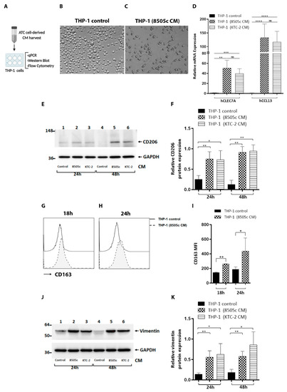 Differentiation of THP-1 monocytes into M2-like macrophages. ATC cell-derived CM induced the expression of M2 macrophage markers in human monocytes. (A) Schematic representation of CM preparation from ATC cells and treatment of THP-1 cells with complete media containing 5% FBS or with 100% CM of ATC cell-derived CM for different periods of time (18 h, 24 h, 48 h), and a variety of parameters were analyzed. (B,C) Soluble factors derived from ATC cells induced morphological changes in THP-1 cells. Monocytes were incubated with complete media containing 5% FBS or treated with ATC cell-derived CM for 24 h. Representative bright-field imaging of THP-1 control (B) or treated with 8505c-derived CM, THP-1 (8505c CM) (C). (D) THP-1 cells treated with ATC cell-derived CM for 24 h showed a significant increase of mRNA expression of hCLEC7A or Dectin-1 and hCCL13 (both markers for M2 macrophages), compared with complete media, measured by RT-qPCR. (E,F) Immunoblot analysis of CD206 in THP-1 cells grown under normal conditions (THP-1 control) or exposed to derived from ATC cells for 24 h and 48 h (E). Quantification of relative expression of CD206 protein in human monocytes after using GAPDH as loading control (F). Uncropped Western Blot is shown in Figure S7. (G–I) Flow cytometry analysis showed significant induction of CD163 in THP-1 cells treated with 8505c-derived CM for 18 h (G) and 24 h (H) compared to THP-1 control. Representative histograms (G,H) and quantification (I) are shown. (J,K) Immunoblot analysis of vimentin in THP-1 cells grown under normal conditions (THP-1 control) or exposed for 24 h and 48 h to CM derived from ATC cells (J). Quantification of relative expression of vimentin protein in human monocytes after using GAPDH as loading control (K). Full Western Blot is shown in Figure S7. Data are expressed as mean ± SD. * p < 0.05, ** p < 0.005, *** p < 0.0005, **** p < 0.0001. ns, not significant. Created with BioRender (Online Software, San Francisco, CA, USA).