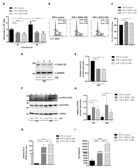 ATC cell-derived CM decreased proliferation of human monocytes. (A) Proliferation of THP-1 cells incubated with complete media containing 5% FBS (THP-1 control) or 100% 8505c-derived CM and 100% KTC-2-derived CM for 24 h or 48 h, estimated by cell counting. (B) Cell cycle profiles of THP-1 cells incubated with complete media containing 5% FBS (THP-1 control) or treated for 24 h with ATC cell-derived CM by flow cytometry analysis. The average percentages of cell populations of different cell cycle phases are shown in the upper-right corner. (C) The graphs showed the percentage of the G0/G1 phase for control and treatment with ATC cell-derived CM in THP-1 cells. The cell cycle phase was quantified by DAPI staining, followed by FACS analysis in THP-1 cells. (D,E) Immunoblot analysis of cyclin D1 in THP-1 cells grown under normal conditions (THP-1 control) or exposed for 48 h to CM derived from ATC cells (D). Quantification of relative expression of cyclin D1 protein in human monocytes after using GAPDH as loading control (E). Full Western Blot is shown in Figure S7. Human monocytes activated by ATC cell-derived CM promoted IL-6 levels via the induction of STAT3 phosphorylation (F,I). (F) Immunoblot for p-STAT3 from THP-1 cells incubated with complete media containing 5% FBS (THP-1 control) or treated with CM derived from ATC cells, 8505c and KTC-2, for 24 h and 48 h. The figure shows a representative Western blot of four independent experiments. The lower panel was the corresponding loading control using GAPDH. (G) Quantification of relative expression of p-STAT3/Total STAT3 proteins in human monocytes. The same blot was stripped and re-blotted using anti-Total STAT3 antibody. Uncropped Western Blot is shown in Figure S7. (H) Expression levels of IL-6. mRNA levels by RT-qPCR in control and THP-1 cells incubated with complete media containing 5% FBS (THP-1 control) or treated for 24 h with ATC cell-derived CM. (I) Secreted IL-6 was measured by ELISA. THP-1 cells were incubated with complete media containing 5% FBS (THP-1 control) or treated for 48 h with ATC cell-derived CM. The media were replaced by fresh media. After 48 h, the supernatant was harvested and used for ELISA assays. Data are expressed as mean ± SD. * p < 0.05, ** p < 0.005, **** p < 0.0001. ns, not significant.