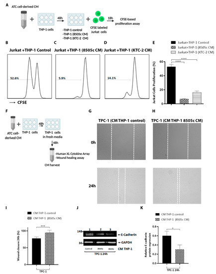 Tumor-educated macrophages by soluble factors secreted by ATC cells exert tumor-promoting functions by decreasing T cell proliferation and increasing thyroid cancer cell migration. (A) Schematic of experiment on Jurkat cell proliferation. THP-1 cells were incubated with complete media containing 5% FBS (THP-1 control) or treated with 100% of ATC cell-derived CM for 48 h. T cells were labeled with CFSE and co-cultured with activated macrophages for 18 h. (B–E) Determination of T cell proliferation by flow cytometry. CFSE-labeled Jurkat cells were co-cultured with THP-1 cells grown under normal conditions (THP-1 control) (B) or pretreated for 48 h with 8505c-derived CM (C) and KTC-2-derived CM (D) at a ratio of 0.5:1 for 18 h. Representative histograms (B–D) and quantification of percentage of T cells after the co-culture (E) are shown. (F) Schematic representation of CM preparation from THP-1 cells. Complete media containing 5% FBS 100% or CM from 8505c cells were used for the treatment of THP-1 cells for 48 h. The medium was discarded and then incubated with fresh medium. After 48 h, CM from THP-1 cells were collected and used (100%) to treat TPC-1 cells. (G,H) Representative cell pictures of wound-healing assay in TPC-1 cells incubated with CM derived from THP-1 control (CM THP-1 (control)) (G) or CM derived from activated THP-1 (CM THP-1 (8505c CM)) (H) for 24 h. (I) Quantitative analysis of wound-induced migration assay from G–H. (J) Immunoblot analysis of E-Cadherin in TPC-1 cells after treatment with CM derived from activated THP-1 cells for 24 h. (K) Quantification of relative expression of E-cadherin protein in TPC-1 cells after using GAPDH as loading control. Uncropped Western Blot is shown in Figure S7. Data are expressed as mean ± SD. * p < 0.05, *** p < 0.0005, **** p < 0.0001. Created with BioRender.