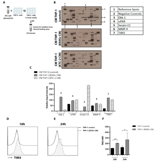 Cytokine array analysis revealed high TIM3 expression on M2-like macrophage-derived CM. (A) Schematic representation of CM preparation from THP-1 cells. Complete media containing 5% FBS or 100% CM from 8505c and KTC-2 cells were used for the treatment of THP-1 cells for 48 h. The medium was discarded and then incubated with fresh medium. After 48 h, 100% CM from THP-1 cells were collected and analyzed by the Proteome Profiler Human XL Cytokine Array Kit. (B) Cytokine array profiling of CM derived from THP-1 cells. Antibodies for detection of each cytokine were spotted in duplicate. Reference spots and negative controls had six and two spots each, respectively. (C) Densitometric analysis revealed that TIM3 was consistently high in both CM THP-1 (8505c CM) and CM THP-1 (KTC-2). (D) TIM3 expression was verified by flow cytometry analysis. THP-1 cells treated with 8505c-derived CM for 18 h (D) and 24 h (E) compared to THP-1 control (incubated with complete media containing 5% FBS). Representative histograms (D,E) and quantification (F) are shown. Data are expressed as mean ± SD. * p < 0.05, ** p < 0.005. Created with BioRender.