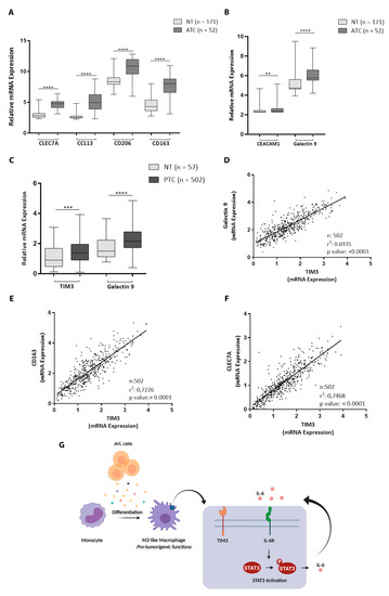 ATC is heavily infiltrated with TAMs, which represent more than 50% of the total tumor mass [19,20,21], with TAMs being characterized by presenting an M2-like phenotype. In order to study the TAM phenotypes in ATCs and using the GEO databases, we compared the expression levels of M2 macrophage markers between 171 normal thyroid tissues and 52 ATCs. As shown in Figure 6A, and in line with our in vitro observations, ATCs exhibited a significantly higher expression of CLEC7A, CCL13, CD206, and CD163 compared with normal thyroids. Furthermore, several ligands for TIM3 have been identified, including galectin-9, and most recently carcinoembryonic antigen-related cell adhesion molecule 1 (CEACAM1), which have been implicated in mediating the TIM3 function [50]. Galectin 9 is expressed in multiple cell types, with CEACAM1 also being highly expressed by some tumor cells [50]. In the same cohort, we found a significant increase in the expression levels of both ligands compared with normal thyroid tissue (Figure 6B). Unfortunately, the TIM3 levels could not be evaluated in ATC due to TIM3 not being found in the datasets used. Therefore, the gene expression levels of TIM3 and galectin 9 were analyzed in papillary thyroid carcinomas (PTCs, n = 502) and normal tissue (n = 57) from The Cancer Genome Atlas (TCGA) datasets. As shown in Figure 6C, the expression levels of TIM3, as well as those of galectin 9 in the PTCs, were significantly higher compared with normal thyroid tissues. In the same cohort, we found a strong correlation between galectin 9 and TIM3 (Figure 6D). In addition, M2 macrophage markers including CD163 (Figure 6E), CLEC7A (Figure 6F), CCL13 (Figure S6A), and CD206 (Figure S6B) were highly correlated with TIM3. Taken together, our results show that M2 macrophage markers and TIM3/galectin-9/CEACAM1 expression levels are increased in thyroid cancer tissues, thereby supporting our in vitro findings.