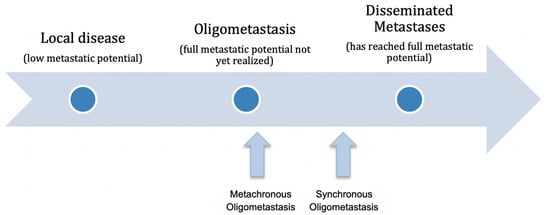 Close to 50% of patients with NSCLC have metastatic disease at the time of diagnosis, with an estimated 5-year survival rate of 6% [8,9]. However, a proportion of patients presenting with metastatic disease will have a limited metastatic burden, rather than widely disseminated disease. Oligometastasis can be broadly defined as a state of limited metastatic tumor burden, with only one or a few sites of metastasis and the potential to benefit from curative intent treatment [1]. Hellman and Weichselbaum theorized that the oligometastatic state is an intermediate state along a tumor’s natural historical progression from a localized primary tumor to a widely disseminated metastatic disease, which represents a condition in which the tumor’s full metastatic potential has not yet been realized (Figure 1). Early in the malignant trajectory, the metastatic cells from the primary tumor have a restricted capacity for growth in distant sites [10]. As the primary tumor grows and gains genetic mutations, cellular clones develop additional growth characteristics, the requirements for metastatic growth are less, and additional metastatic sites are established [10]. It was proposed that if eradication of the primary tumor and the oligometastatic sites could be achieved early in the metastatic continuum, progression to the widely disseminated state could be prevented, and cure potentially possible [1,11,12,13].