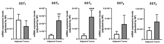 mRNA expression levels of Somatostatin Receptors. mRNA expression levels of SSTs genes were measured by qPCR and adjusted by normalization factor. Values represent the mean ± SEM. Asterisk represents statistically significant differences (**, p < 0.01; ***, p < 0.001).