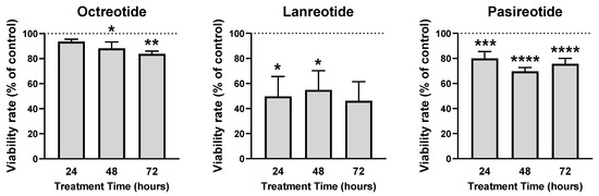 In the present study, we also explored the effect of different SSAs (octreotide, lanreotide, and pasireotide) on the proliferation rate of patient-derived primary OSCC cell cultures. Remarkably, our results demonstrated that all SSAs tested (10−7 M) significantly reduce the proliferation rate of primary OSCC cell cultures OSCC (Figure 2). Specifically, all SSAs decreased proliferation rate at 24-, 48-, and 72-h of incubation (this inhibition was not statistically significant in the case of octreotide at 24 h and lanreotide at 72-h) (Figure 2).