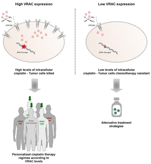 - Planells-Cases, R.; Lutter, D.; Guyader, C.; Gerhards, N.M.; Ullrich, F.; Elger, D.A.; Kucukosmanoglu, A.; Xu, G.; Voss, F.K.; Reincke, S.M.; et al. Subunit composition of VRAC channels determines substrate specificity and cellular resistance to Pt-based anti-cancer drugs. EMBO J. 2015, 34, 2993–3008. [Google Scholar] [CrossRef]